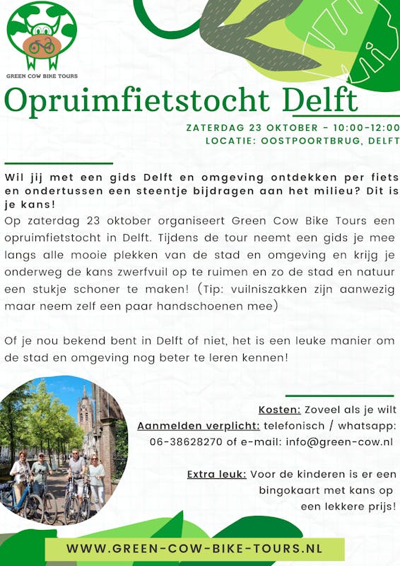 Op zaterdag 23 oktober organiseert Green Cow Bike Tours een opruimfietstocht in Delft. Tijdens de tour neemt een gids je mee langs alle mooie plekken van de stad en omgeving en krijg je onderweg de kans zwerfvuil op te ruimen om zo de stad en natuur een stukje schoner te maken! En omdat de fietstocht tijdens de herfstvakantie plaatsvindt is er voor kinderen ook een leuke bingo voor tijdens de tour beschikbaar.
