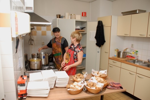 Woensdagmiddag hebben de vrijwilligers & buurtverbinders de zaal in een sfeervolle ruimte omgebouwd. In de keuken was het een drukke maar gezellige boel, onder leiding van Irma en Marguerite zijn de borden opgemaakt. Kalkoen, Rollade en zelfs een bal gehakt stond er op het 3 gangen menu.