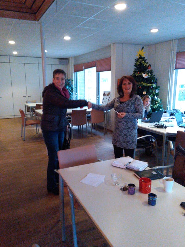 Rita ( links ) wordt gefeliciteerd door buurtverbinder Anja en neemt haar kaartjes in ontvangst